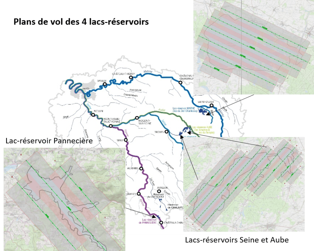 Actuellement, la période de vidange des lacs-réservoirs se termine, laissant un faible tirant d’eau dans leur cuvette. La surface émergée observée à cette période de l’année est donc importante, ce qui est idéal pour l’acquisition lidar. Les zones qui restent immergées toute l’année seront sondées ultérieurement par bathymétrie.