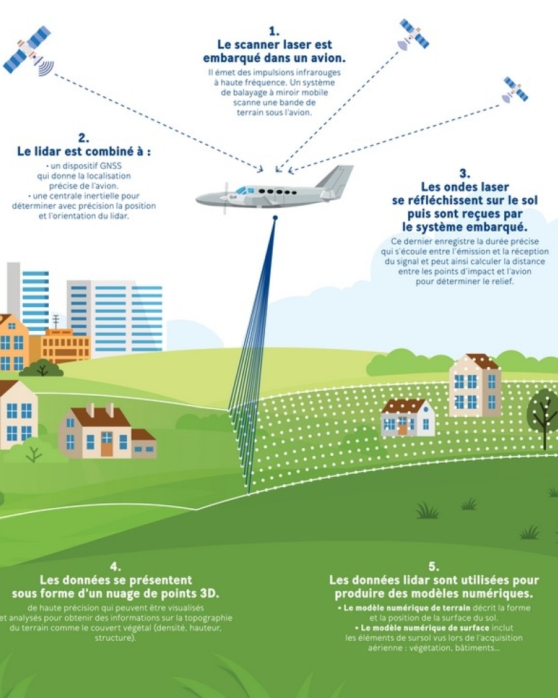 Fonctionnement du lidar aéroporté. Source : https://www.ign.fr/institut/kiosque/lidar-aeroporte-des-mesures-de-precision
