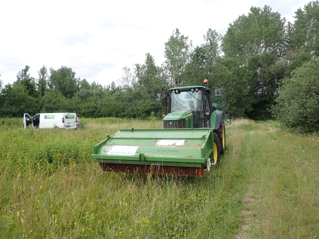 Brossage des prairies pour récupération des graines sauvages pour le projet de la Bassée (Photo : Société Semence Nature)