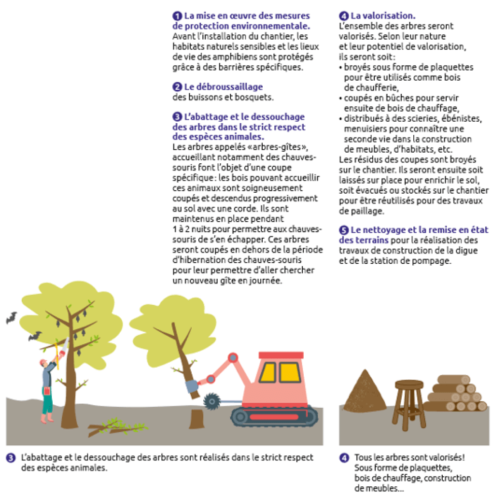 Les opérations de défrichement nécessaires pour les mesures écologiques concernent uniquement des espèces d’arbres dits « non-nobles » : saules, peupliers, cornouillers et pruneliers.