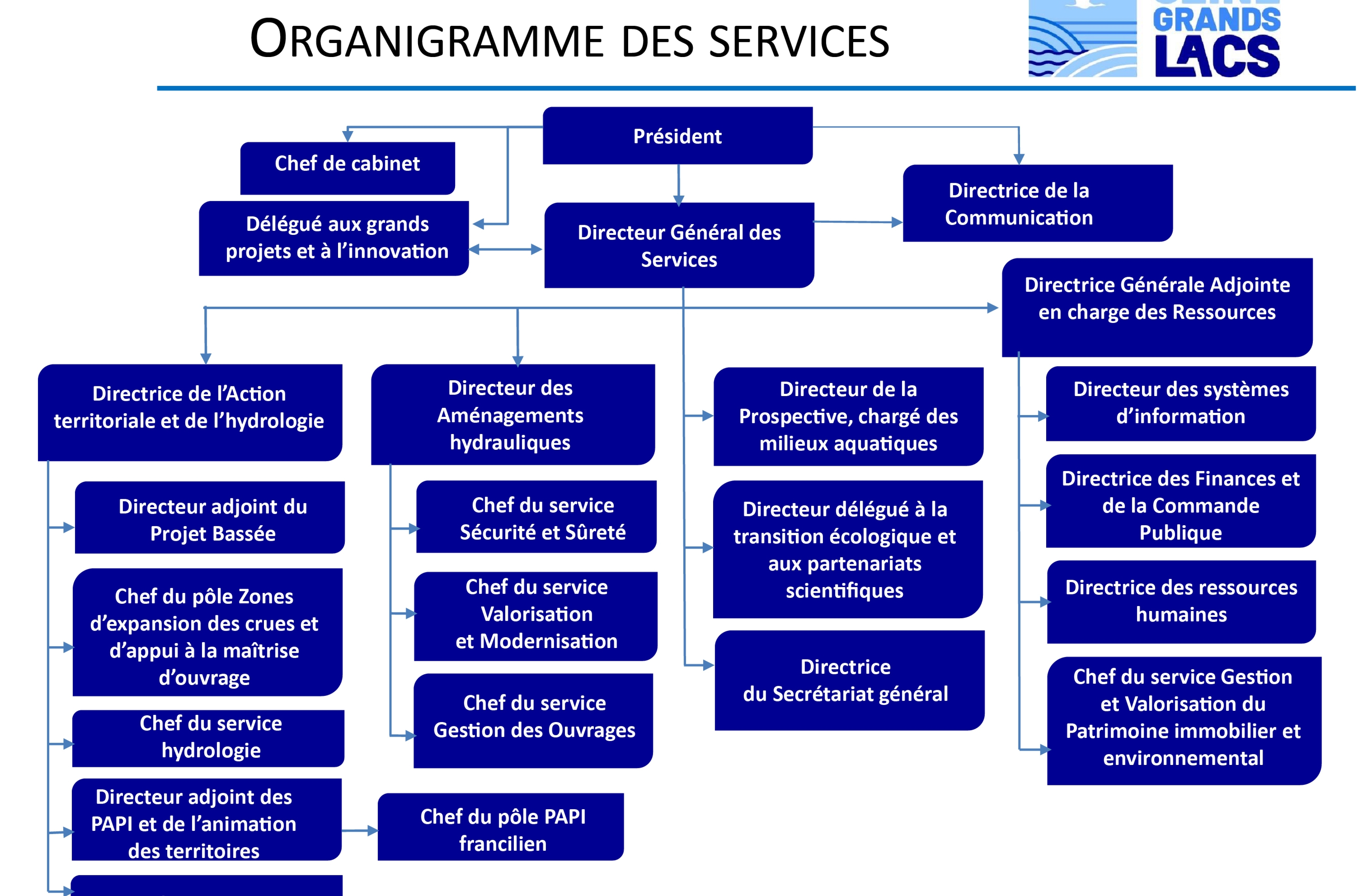 Présidé par Patrick OLLIER, Seine Grands Lacs compte plus de 130 agents répartis sur 11 services. Nos agents œuvrent au bon fonctionnement des ouvrages, à l'entretien de ses emprises mais aussi à la cohérence des actions de l'établissement sur son territoire.