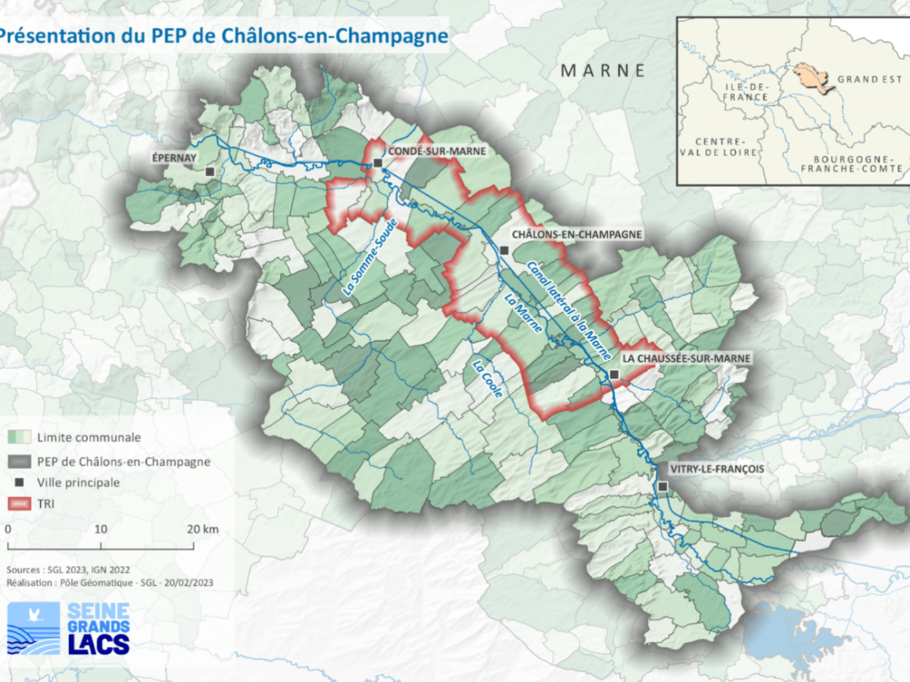 Le territoire du PEP de Châlons et ses 173 communes (10 EPCI) coïncide avec celui du syndicat mixte de la Marne moyenne. Il englobe également le Territoire à Risques importants d’Inondation (TRI) de Châlons-en-Champagne regroupant 32 communes allant de la Chaussée-sur-Marne à Condé-sur-Marne.